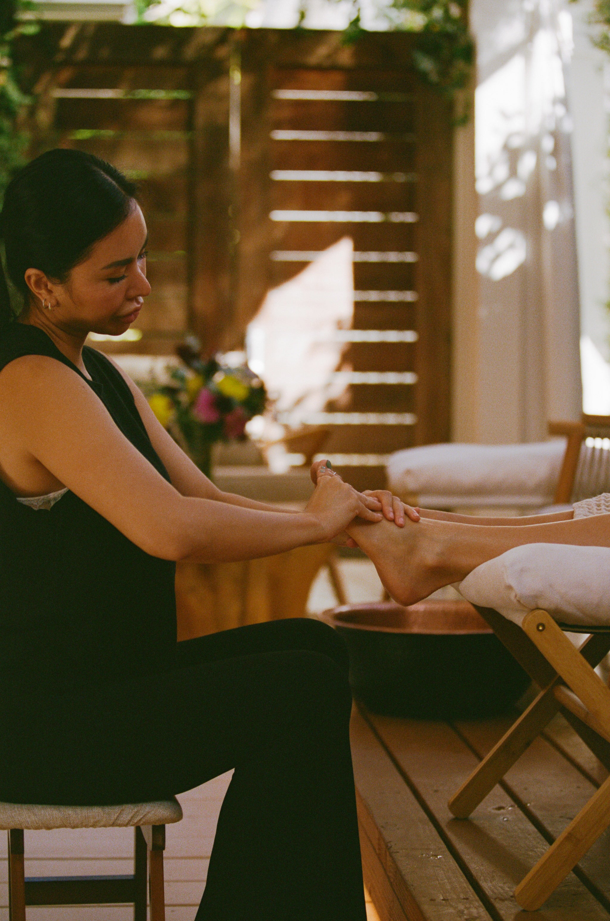 - Each session includes a head, neck, and shoulder massage, followed by a warm botanical foot soak and a soothing foot and leg massage.